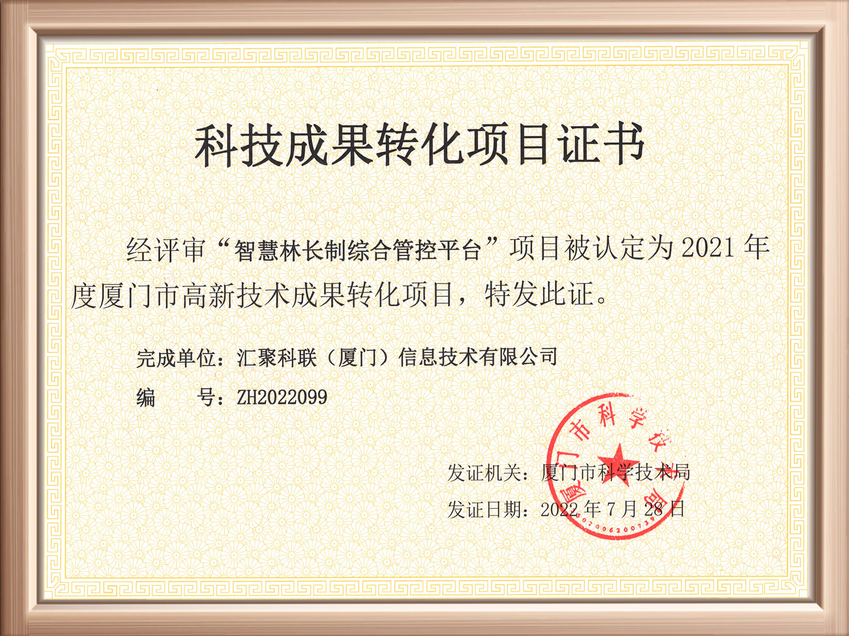 近日,匯聚科聯(lián)收到廈門市科技局頒發(fā)的“科技成果轉(zhuǎn)化項(xiàng)目證書”,公司“智慧林長制綜合管控平臺(tái)”經(jīng)過評選,成功被認(rèn)定為2021年度廈門市高新技術(shù)成果轉(zhuǎn)化項(xiàng)目。